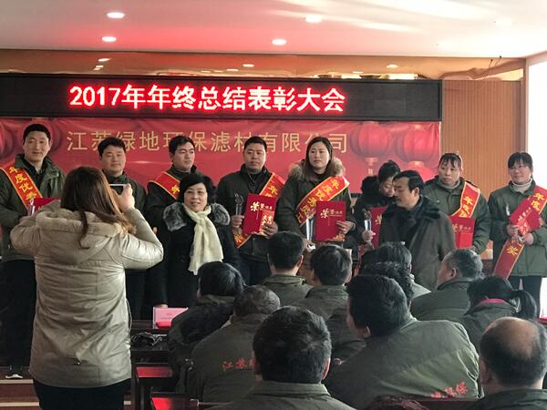 2月8日上午,江蘇綠地環保濾材有限公司在公司三樓會議室成功召開了2017年年終總結表彰大會。 會議首先由周金華廠長對全年2017年工作進行了回顧總結,北京公司劉總對2017年工作進行了點評,特邀代表大自然環保孫總做了重要講話。公司對現場投票產生了8名2017年度優秀員工、10年員工進行頒獎并合影。